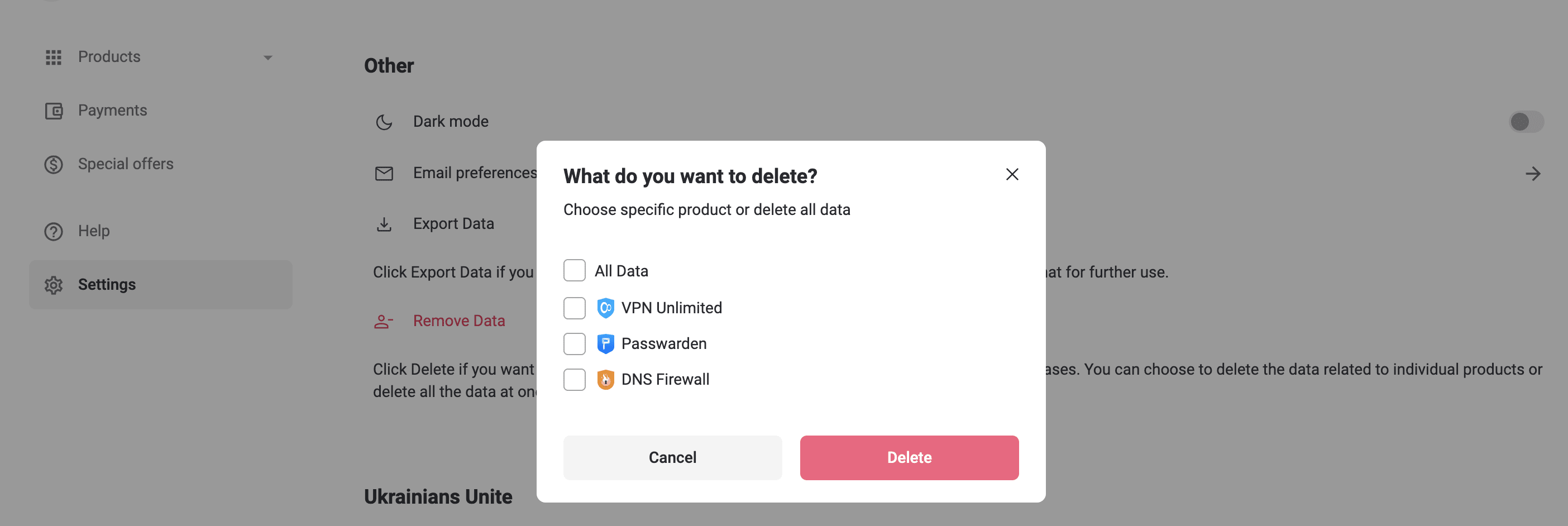 • To delete data for specific services: Select the services you want to remove (e.g., VPN Unlimited, Passwarden, DNS Firewall) and click Delete.