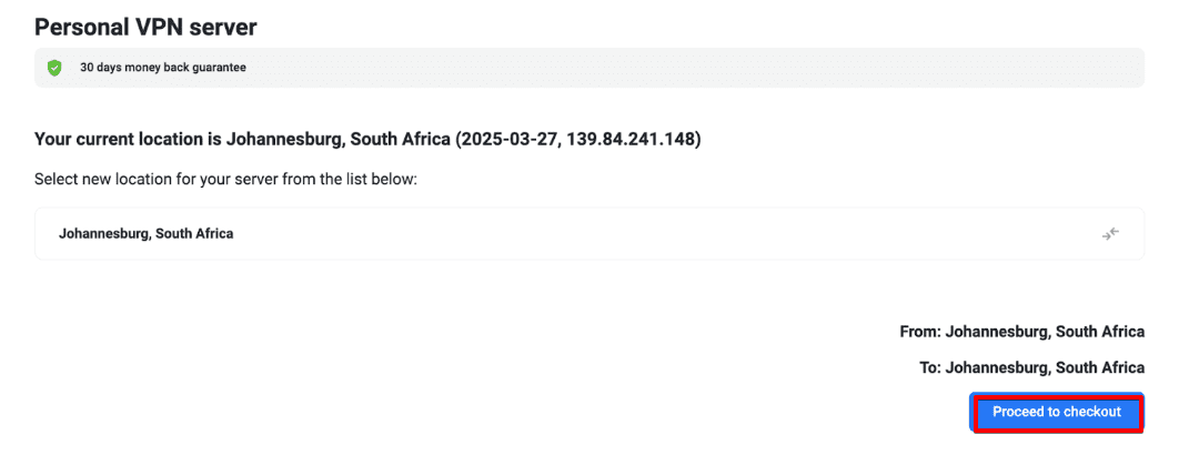 • Press Change, select the desired location, click Proceed to checkout, and complete the payment via any available method.