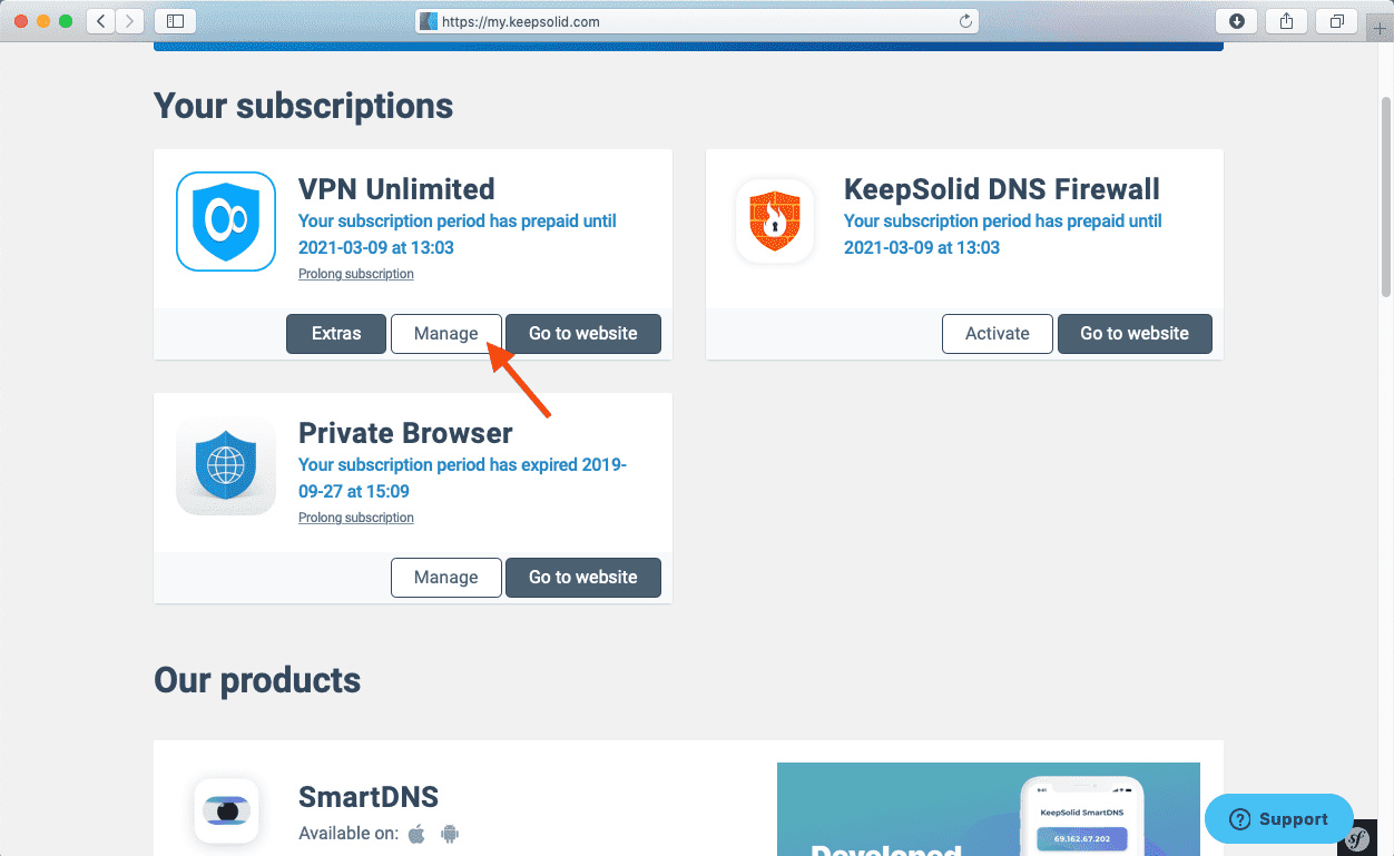 Entre em seu Escritório do Usuário > selecione a aplicação VPN Unlimited > clique em Manage (Gerenciar).