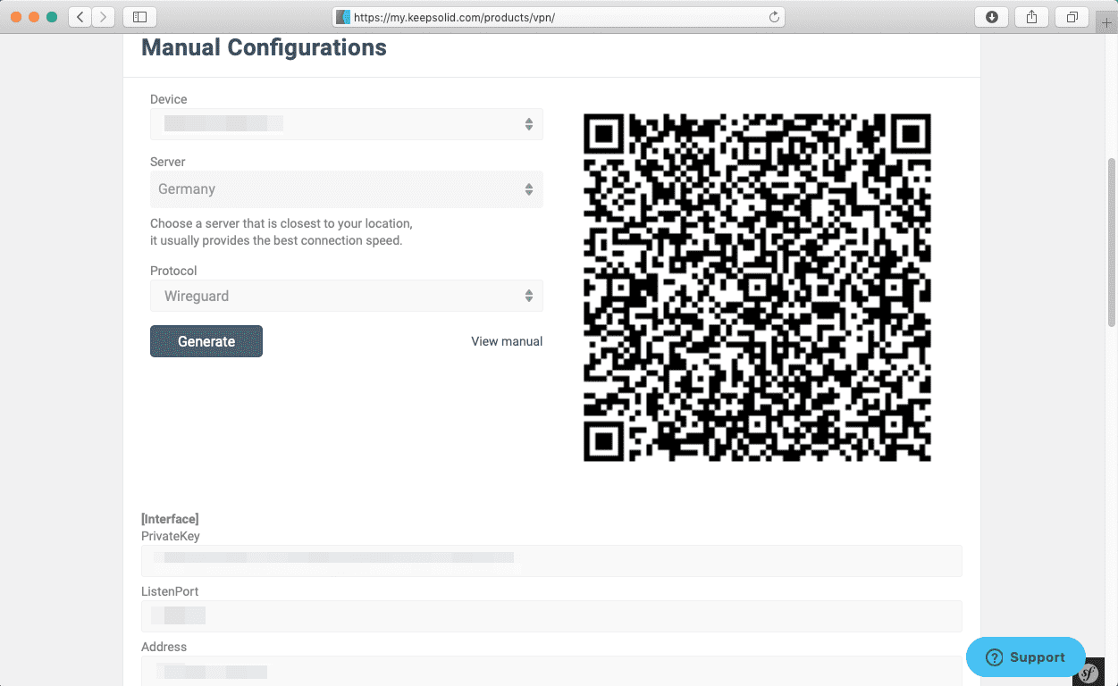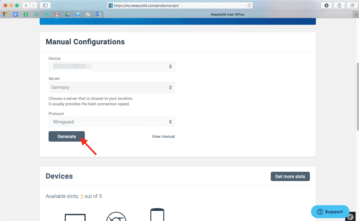 Pressione o campo sob Device (Dispositivo) e clique em Manually create a new device…(Criar um novo dispositivo manualmente…) > defina seu nome personalizado, por exemplo, WireGuard > escolha a localização apropriada do Server (Servidor) > selecione o protocolo WireGuard a partir do menu suspenso > clique em Generate (Gerar).