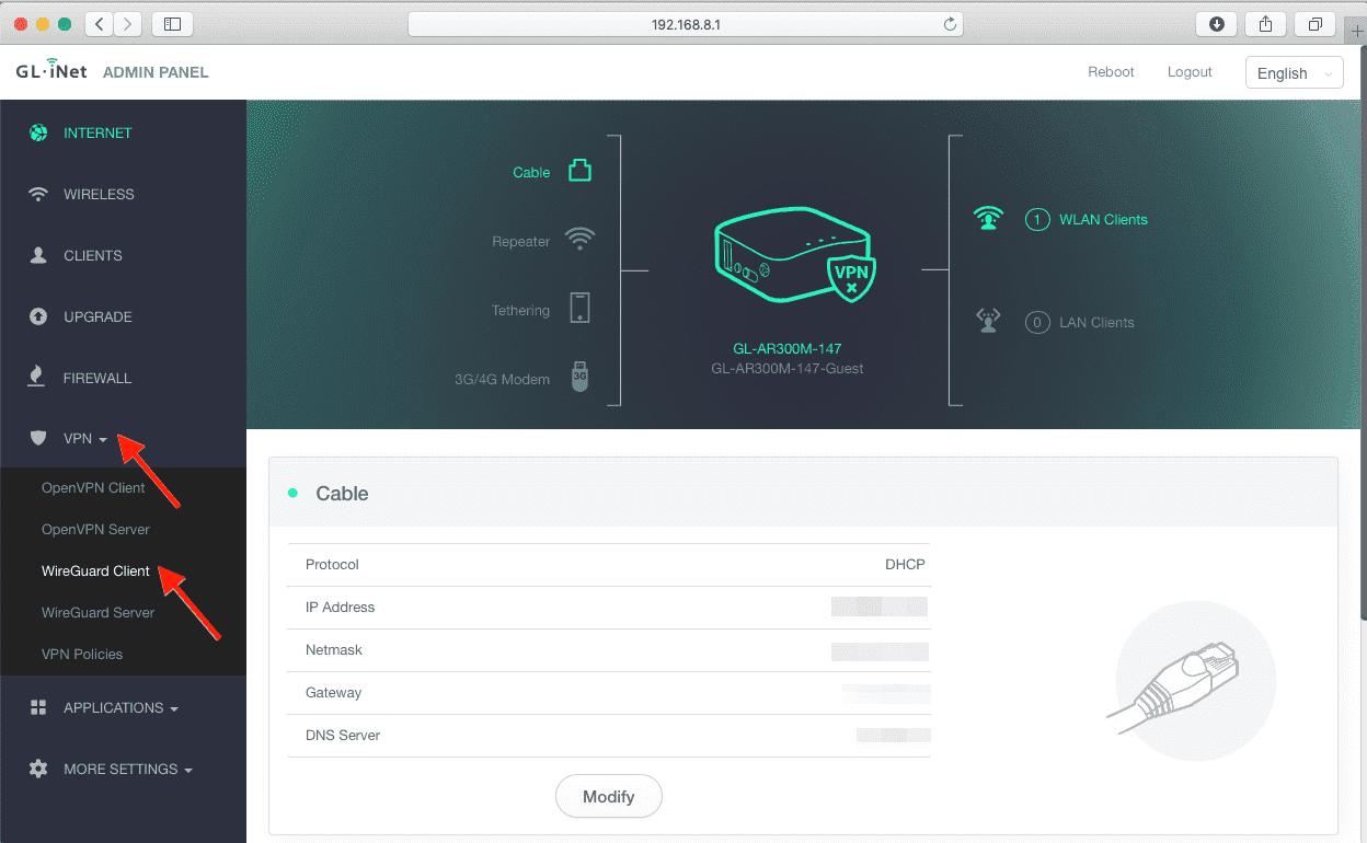 Conecte seu dispositivo ao roteador GLiNet e digite o endereço IP do painel de administração na linha de endereço do navegador. Encontre o endereço IP na parte de trás do seu roteador ou siga este guia. Acesse o Painel de Administração e clique em VPN > Cliente WireGuard.