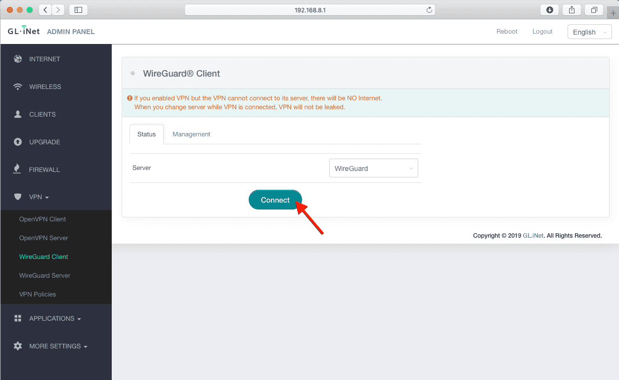 3. Conecte-se ao servidor VPN no roteador GLiNet