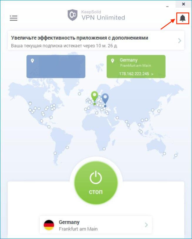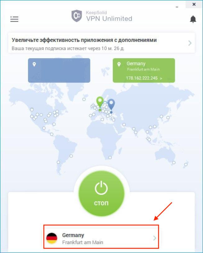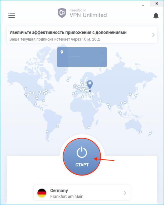 Начнем с главного экрана нашего приложения VPN для Windows. Здесь вы можете включить или выключить ваше VPN соединение. Чтобы это сделать, нажмите на кнопку Старт/Стоп.