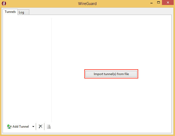 1. 打开此 WireGuard 应用,点击 Import tunnel(s) from file(从文件导入通道),然后选择从 用户主页自动下载的 WireGuard 配置文件。